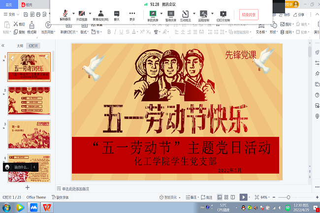 为庆祝“五一”国际劳动节,大力弘扬劳动精神和工匠精神,致敬平凡而伟大的劳动者,4月29日,韦德bevictor员工党支部举办“五一劳动节”主题党日活动,员工党支部书记、全体员工党员参加此次活动。因疫情防控要求,活动采用线上形式,田径队党支部书记王大鹏主持。