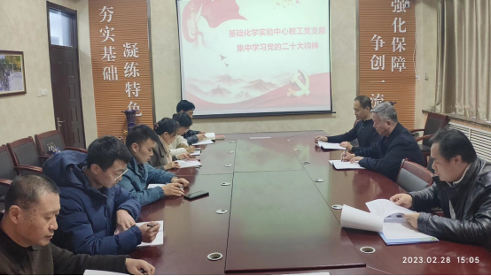 为深入学习贯彻党的二十大精神,更加自觉地遵守党章、贯彻党章、维护党章、加深对党的理论知识的理解,2月28日,基础化学实验中心教工党支部召开全体党员大会,集体学习《中国共产党章程(修正案)》。