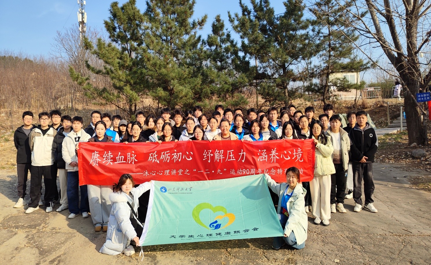 讲座结束后,参与师生共同前往笔架山开展徒步登山活动,以行走致敬历史,以攀登凝聚精神。登山途中,同学们积极运用课堂所学方法缓解身体疲劳,在亲近自然中释放情绪、舒缓压力,进一步体会到协作与陪伴对提升心理韧性的重要意义。
