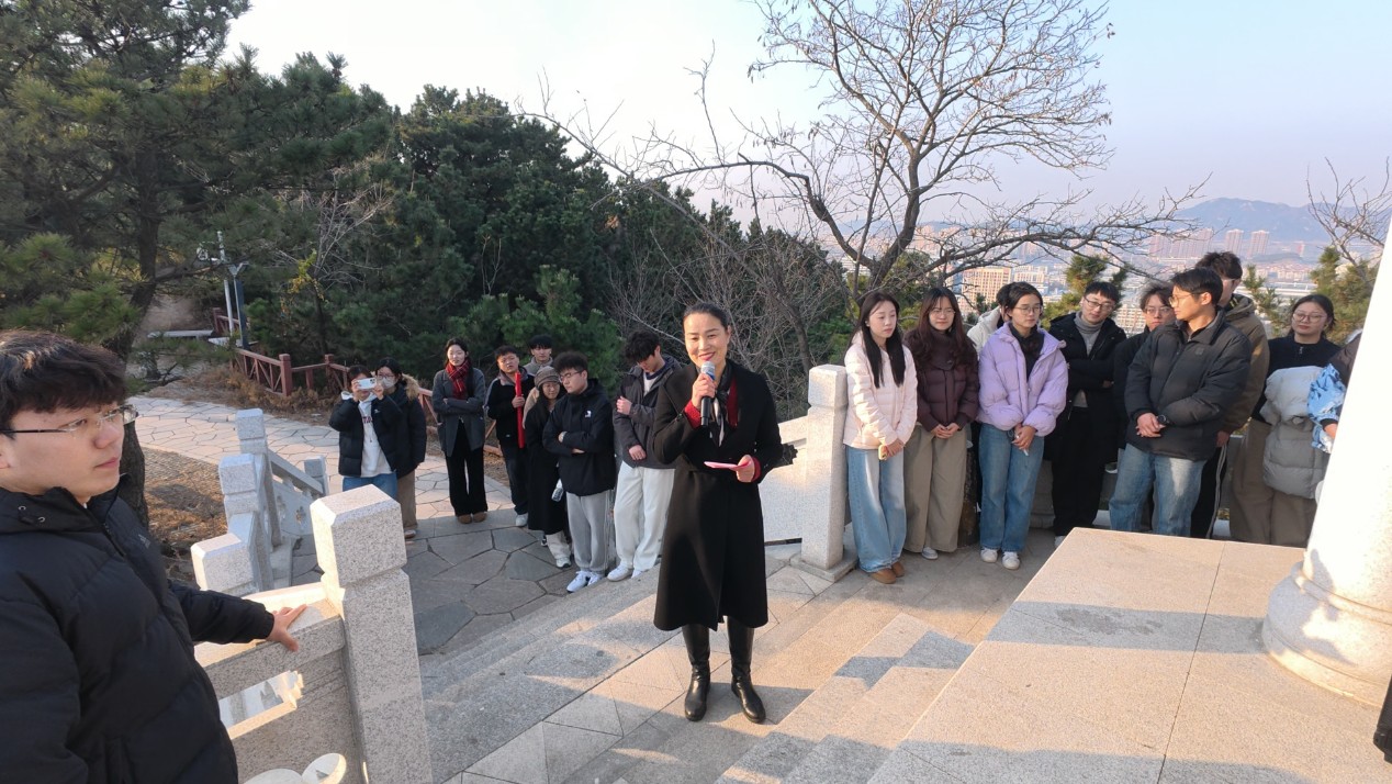 在山腰较为平坦处,曹龙伟带领师生回顾了1935129日北平员工抗日救亡运动的壮烈历程,90年前爱国员工们“抗日救亡”的呐喊仿佛穿越了时空,让在场师生深受震撼。随后,2024级专硕第二团支部书记李郑雨阐述了“一二·九”运动的历史意义,指出其揭露侵略阴谋、推动全民觉醒、促进抗日民族统一战线建立的重要作用。现场师生神情肃穆,深刻体悟到今日和平源于昔日热血。重温历史后,队伍再次出发,两队师生齐呼“顶峰相见”,既是对登山目标的宣告,也寓意新时代青年追求理想、勇担使命的坚定誓言。