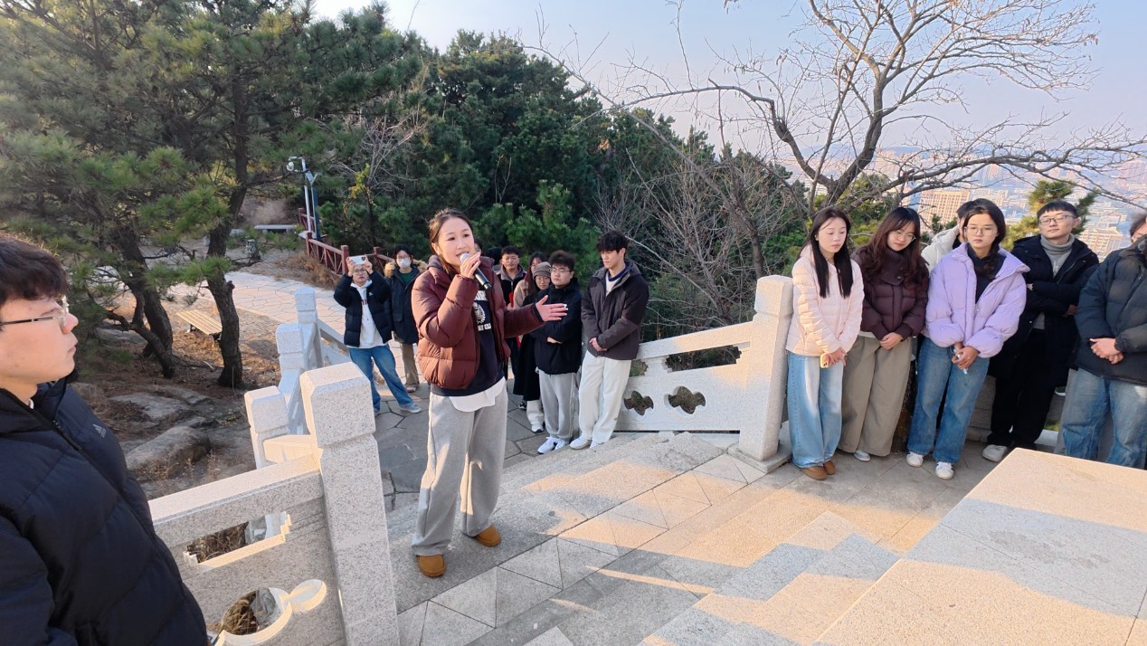 活动尾声,全体师生俯瞰美丽的山科校园,遥望巍巍群山,聆听优秀本科生代表姜昕彤演唱经典爱国歌曲《我爱你,中国》。当歌声与松涛相合,在场师生的情感也随旋律而升华,动情处即随之齐唱,悠扬婉转的歌声在山间回响,爱国爱校的美好情愫在师生心中萦绕,课程也进入了尾声。最后,易凡总结指出,“一二·九”运动彰显了“我先上”的爱国勇气,松柏精神代表着“压不垮”的担当脊梁。她勉励青年学子将“朝乾夕惕”作为日常修行,以“挺膺担当”回应时代召唤,把“矢志复兴”融入终身使命。