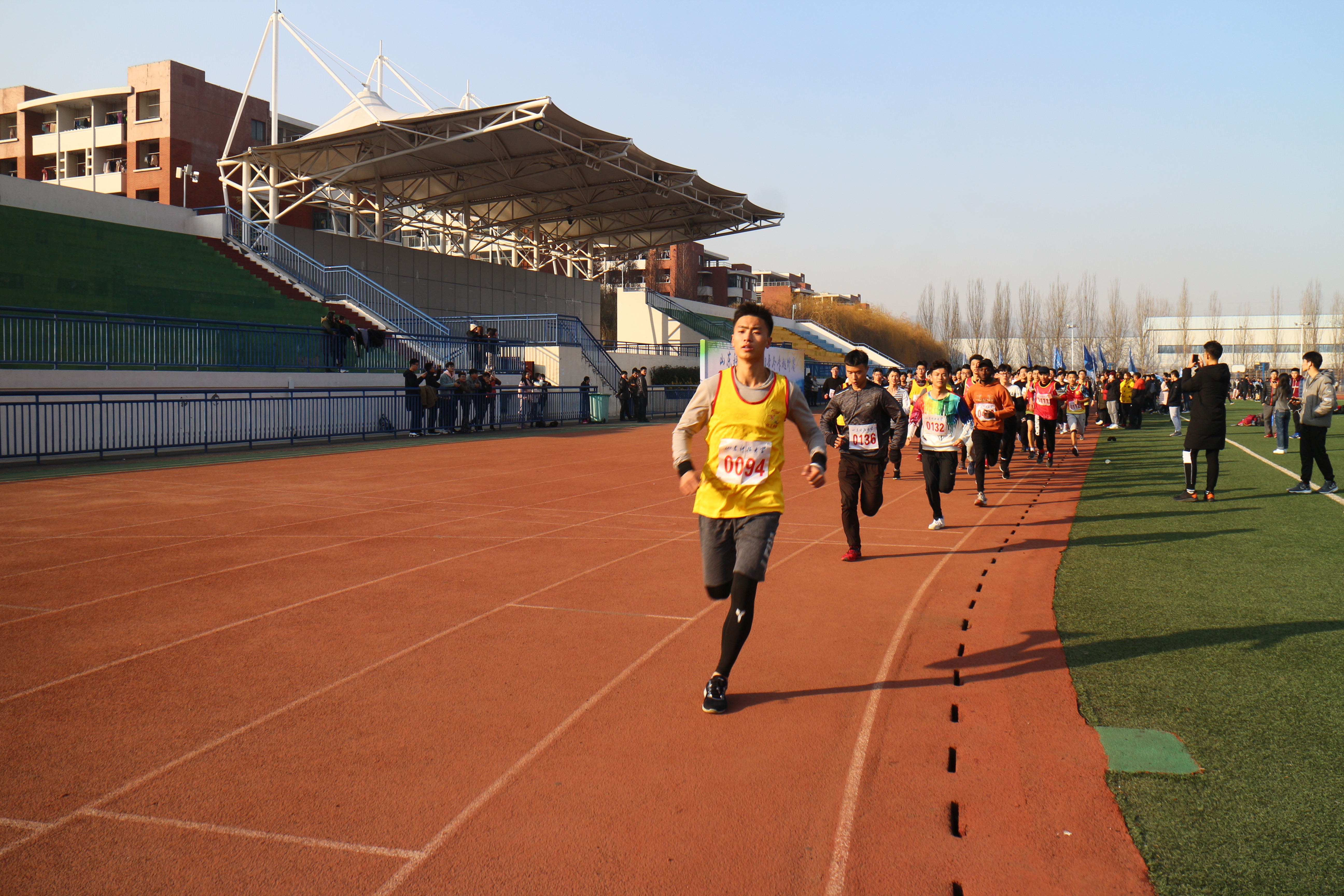 12月18日下午,冬季越野赛在风雨操场鸣枪开跑。此次越野赛有来自各公司共计三百余名选手参加,比赛分为男子组和女子组。女子组于14点15分在跑道100米起点处率先出发,十五分钟后男子组开跑。女子组将绕校园一圈,赛程共计五千米;男子组将绕校园两圈,赛程共计一万米。