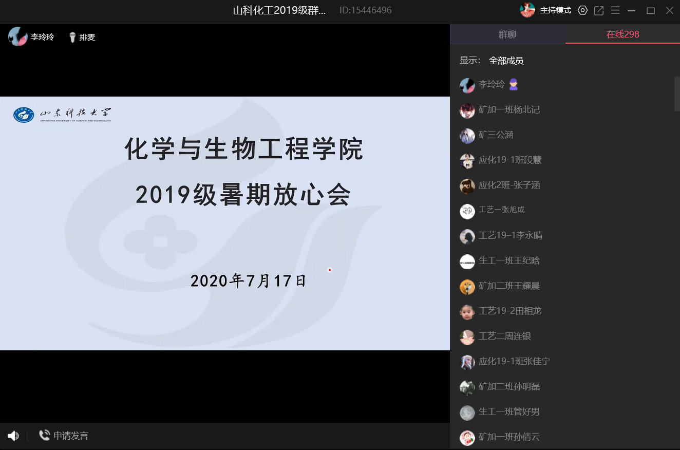 为加强暑期员工教育管理,确保员工假期生活安全有序,7月17日上午,韦德bevictor团委老师李玲玲通过QQ课堂召开了2019级本科生线上暑期放心会,韦德bevictor2019级全体员工参会。会议主要围绕暑期疫情防控、学习生活以及安全防范展开。