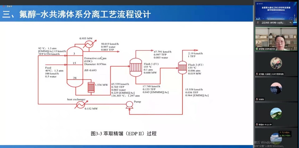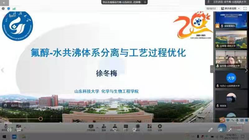2021年10月21-23日,“全国第九届化工热力学学科发展暨碳中和绿色发展会议”成功举办。中国化工学会离子液体专业委员会委员、公司徐冬梅教授应邀做了题为《氟醇-水共沸体系分离与工艺过程优化》的大会报告,与参会的500多位专家学者分享了基于离子液体为萃取溶剂在氟醇-水共沸体系分离领域所做出的前瞻性研究和相关成果,取得了良好的交流效果。
