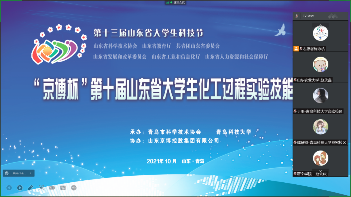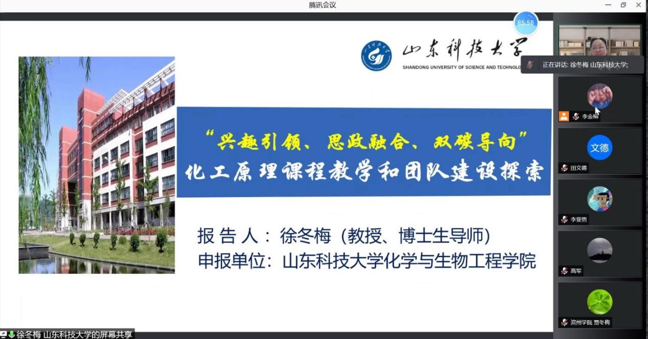 在竞赛期间,由山东省老员工化工过程实验技能竞赛委员会、化工过程国家级实验教学示范中心(青岛科技大学)联合主办的“全省化工专业一流课程线上教学研讨会”在10月31日下午召开。受组委会邀请,公司徐冬梅教授在会议上作了题为“兴趣引领、思政融合、双碳导向”化工原理课程教学和团队建设探索的一流课程建设专题报告,和参会的50多位专家分享了公司在化工原理课程和一流课程建设方面的成果和经验,取得了良好的交流效果。