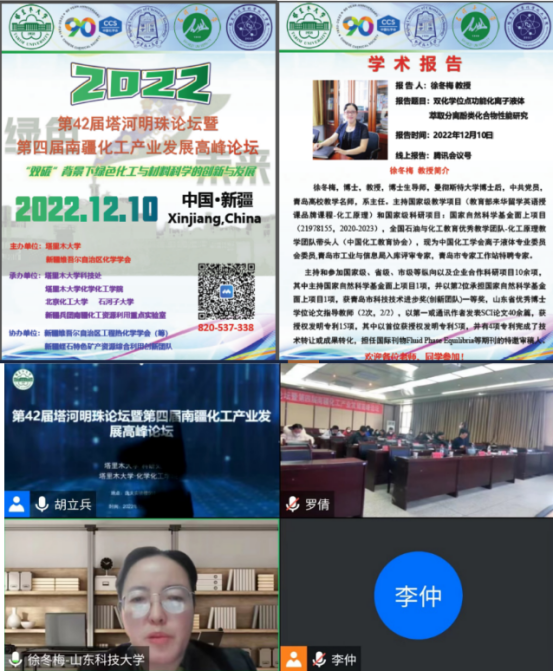 2022年12月10-12日,“第42届塔和明珠论坛暨第4届南疆化工产品发展论坛”在新疆塔里木大学成功举办。会议的主题为“双碳”背景下绿色化工与材料科学的创新与发展。中国化工学会离子液体专业委员会委员、公司徐冬梅教授应邀作了题为“双化学位点功能化离子液体萃取分离酚类化合物的研究”的大会报告,分享了离子液体萃取分离煤热解油中酚类化合物领域所做出的前瞻性研究和成果。此次年会由新疆维吾尔自治区化学学会和塔里木大学主办,由塔里木大学、北京化工大学、石河子大学和新疆兵团南疆化工资源利用工程实验室联合承办。