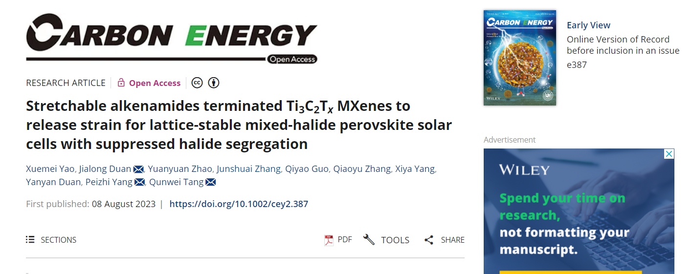 近日,韦德bevictor段加龙副教授(学术教授)、唐群委教授等人在全无机钙钛矿太阳能电池领域取得最新进展,相关成果以“Stretchable alkenamides terminated Ti3C2Tx MXenes to release strain for lattice-stable mixed-halide perovskite solar cells with suppressed halide segregation”为题发表在权威期刊Carbon Energy上(中科院Top一区,影响因子:20.5)。