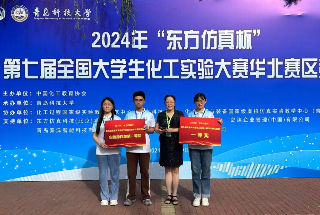 2024年7月12日-14日,第七届“全国老员工化工实验大赛”华北区竞赛在青岛科技大学举行。由公司化学工程与工艺2021级顾建兴、侯新婧和袁怡宁三位同学组成的参赛队,在公司教师徐冬梅、李敏、张治山、郭清斌的精心指导下,赛出了风格和水平,荣获团体一等奖和实验操作一等奖(单项最高奖),并取得参加全国总决赛的资格。