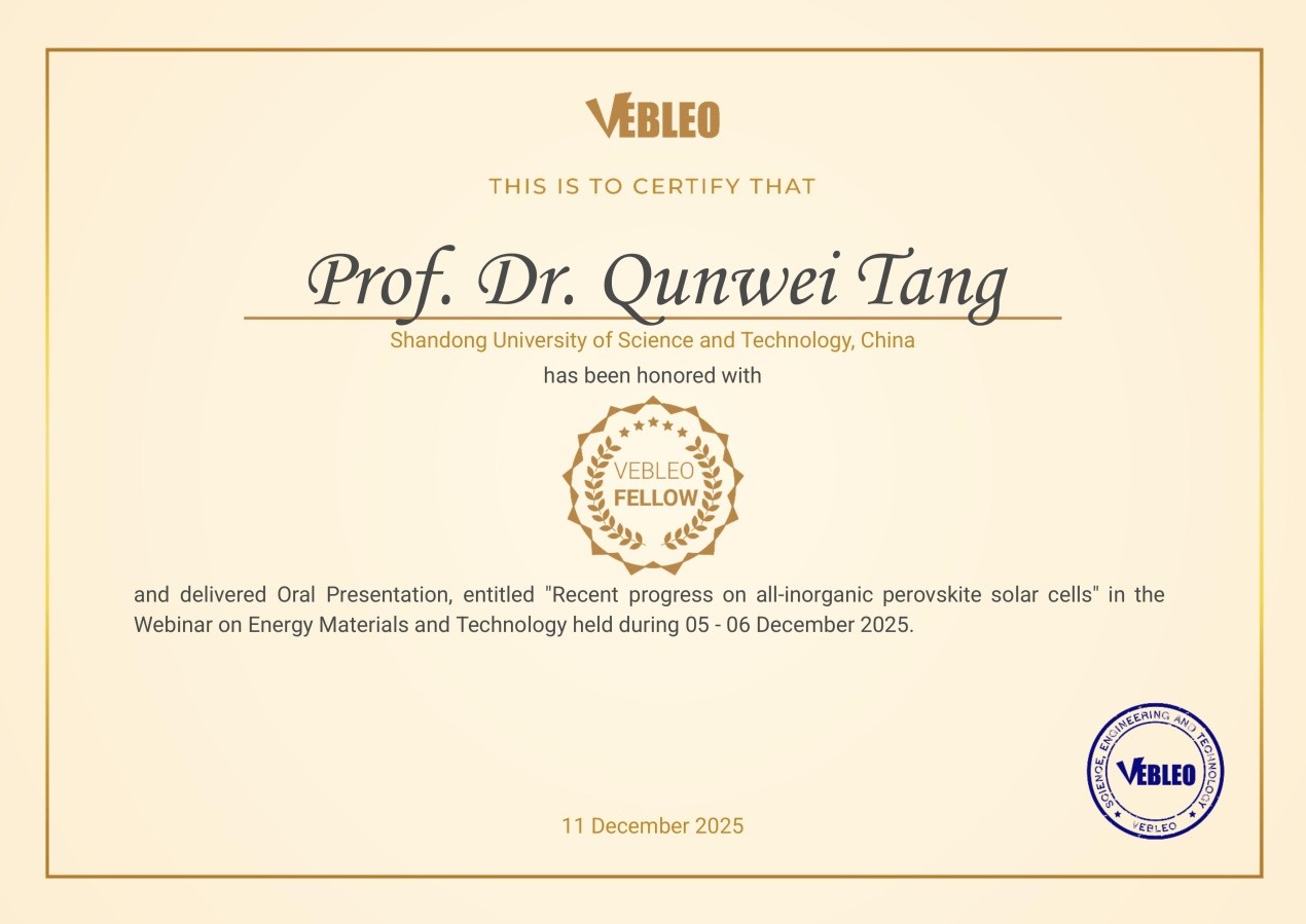 2025年12月11日,公司唐群委教授被授予国际科学组织Vebleo协会会士(Vebleo Fellow),并于12月5日受邀在Vebleo协会主办的能源材料与技术国际会议上作了题为“Recent progress on all - inorganic perovskite solar cells”的特邀报告。