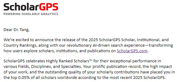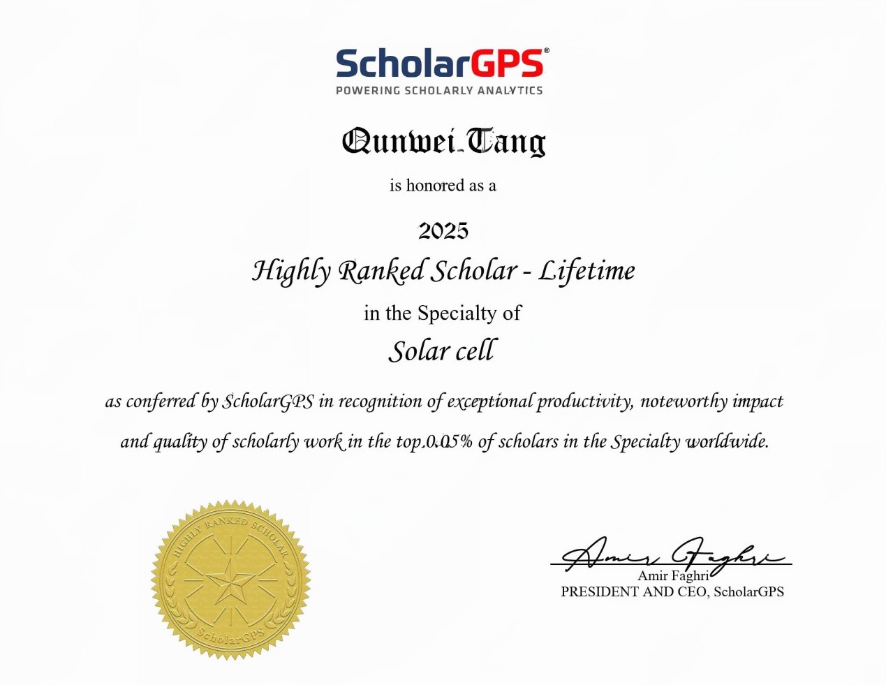 国际学术机构ScholarGPS发布了2025年度全球前0.05%顶尖科学家(Highly Ranked Scholar)榜单,公司唐群委教授凭借在太阳能电池领域的卓越贡献,入选“终身榜单”(Highly Ranked Scholar - Lifetime)全球第69位。该榜单收录依据发表、影响和质量综合评估,进入全球前0.05%的顶尖学者。