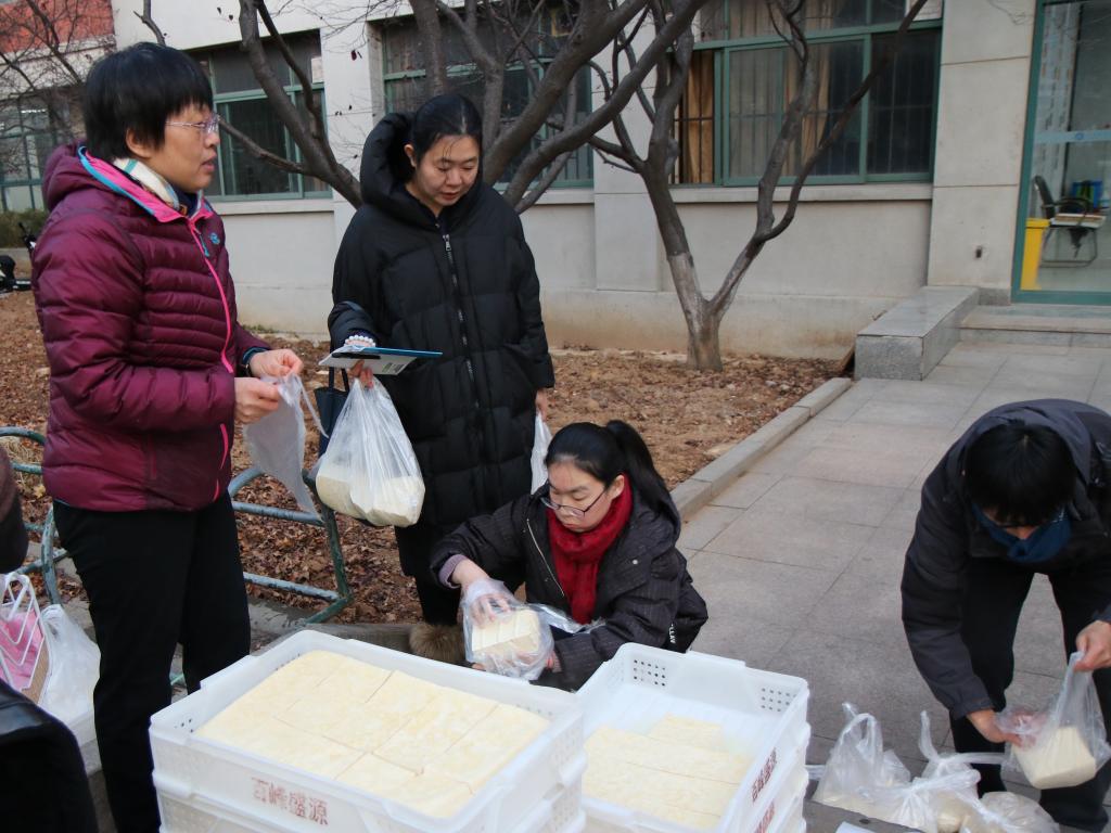 本周是生物工程2017级员工参与生产实习的时间,员工们进入企业学习豆腐制作工艺,并独自完成制作全过程。泡豆——磨浆——煮浆——点浆——压榨成型——脱布——成品,员工们分工明确,一丝不苟地进行着每一步操作,最终制作出热气腾腾、香气扑鼻的豆腐。员工们将做好的一筐筐豆腐运到公司,送给可敬可爱的老师们。
