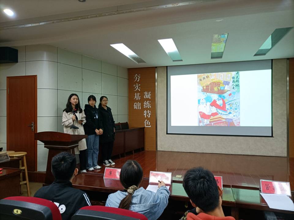 选手们用海报展现才华,用声音传递能量,经过选拔,共有10件优秀作品进入到决赛。决赛现场,屏幕闪烁,选手们结合精心制作的PPT依次进行生动演说,阐述作品寓意、诠释创作灵感,用最生动的语调、最饱满的热情赢得全场阵阵掌声,评委们聚精会神、仔细聆听,认真客观地对选手进行分。在等待最后成绩出炉的紧张时刻,互动游戏“你画我猜”使现场氛围轻松起来,各组参赛人员积极参与,充分发挥了想象力,增进了同学间的默契,加强了交流。