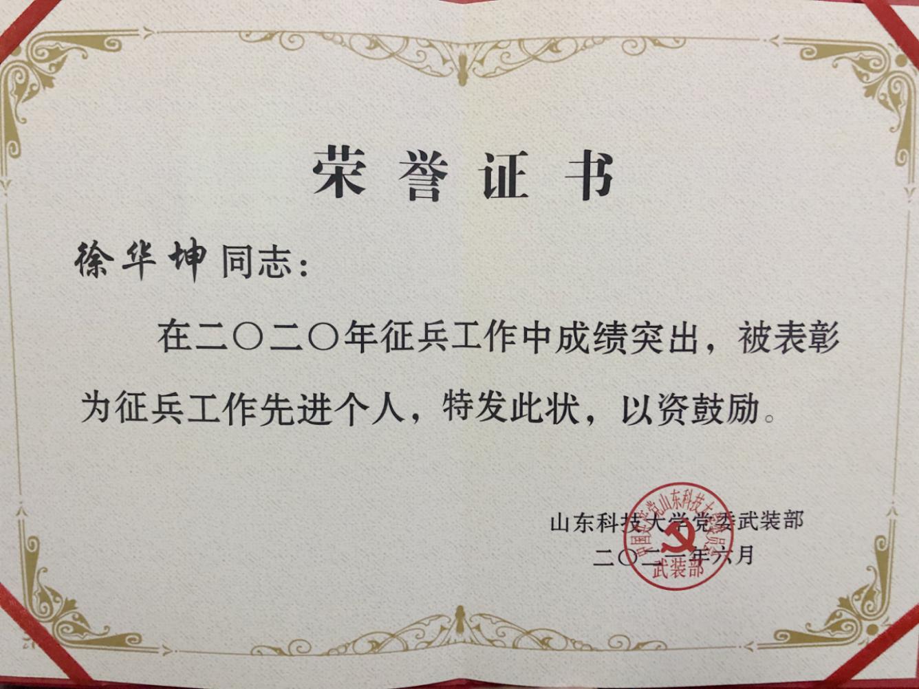 近日,在公司2020年征兵工作总结表彰大会上,公司荣获 “2020年度征兵工作先进单位”称号,公司辅导员徐华坤荣获“2020年度征兵工作先进个人”称号。