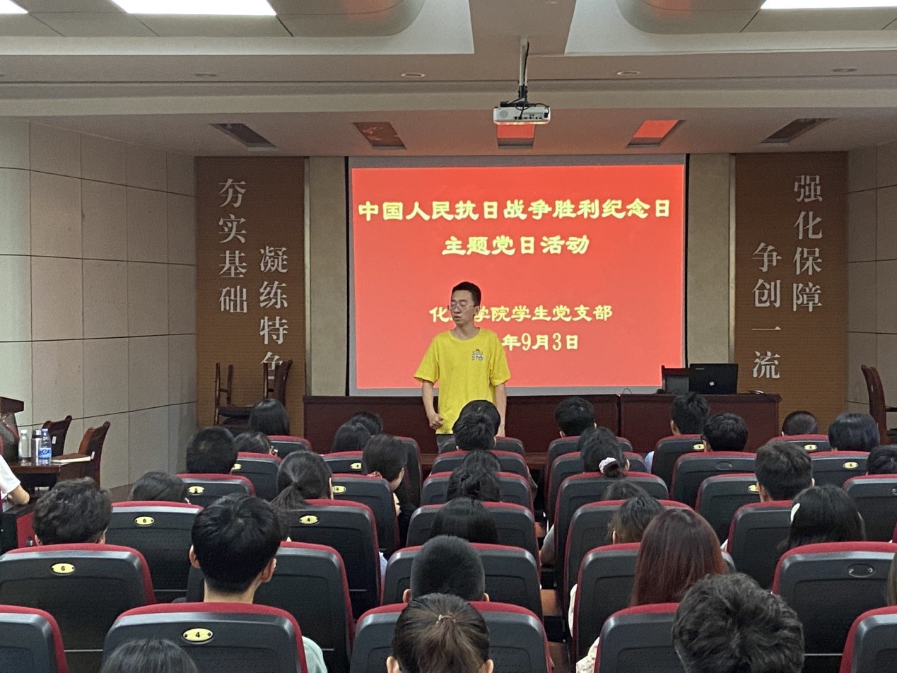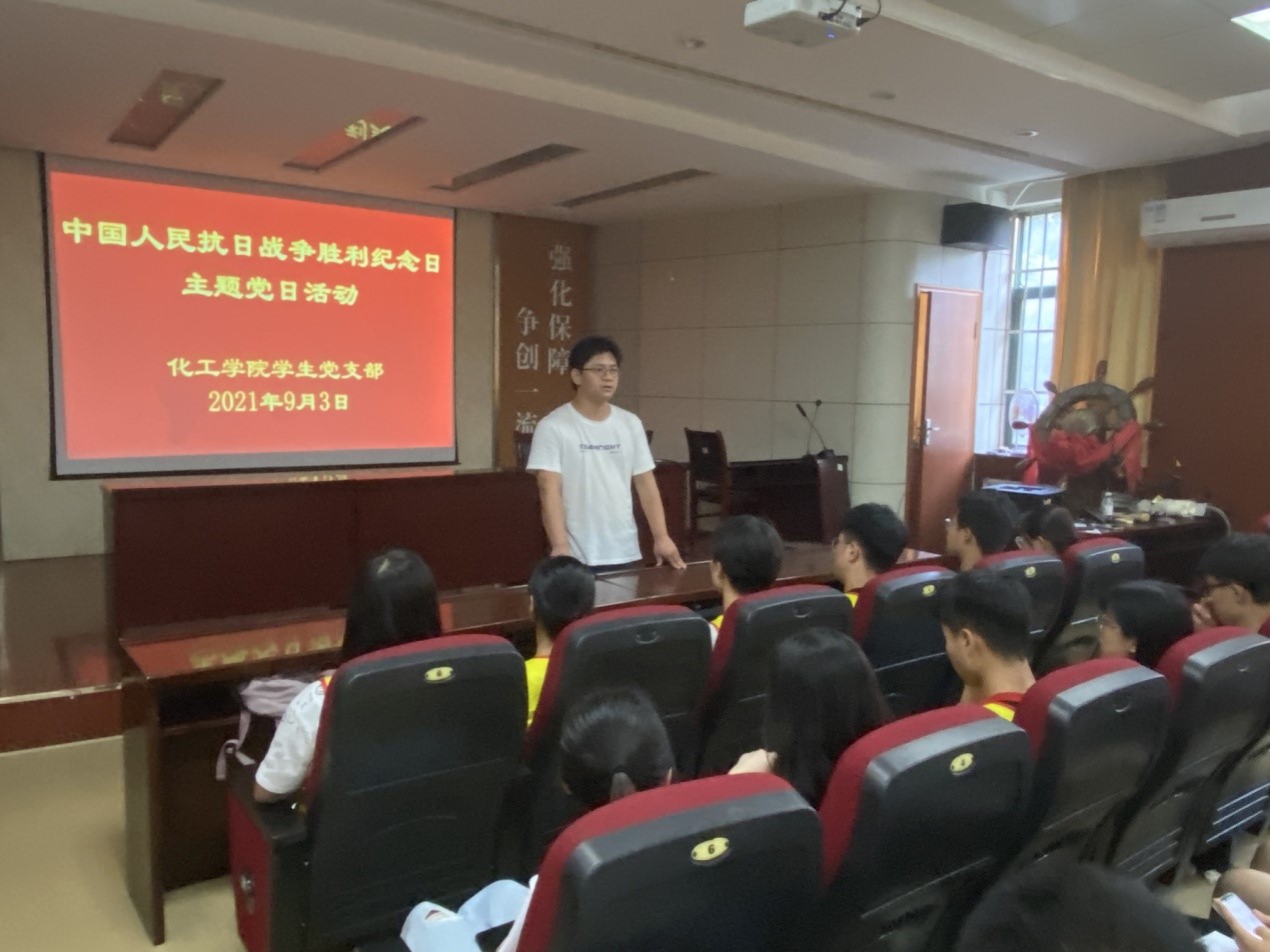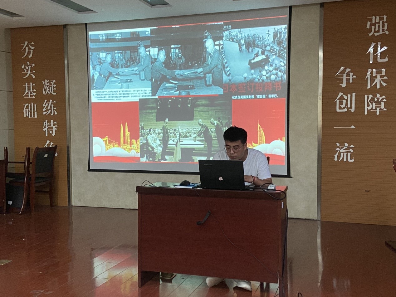 随后,研究生党员王顺民为在场党员讲述抗日战争历史。他以视频《岂曰无名,河山即名》为开场,讲述了中国人民抗日战争胜利纪念日的起源,从中国人民开始摸索救国道路,到中国共产党成立,再到14年的抗日战争,“遍地哀鸿满城血,无非一念救苍生!”正是无数的中国人民付出了无尽的鲜血,才换来了如今的幸福生活。在场党员共同观看了中国人民热烈庆祝抗日战争胜利的场景视频,视频中传来1945年为庆祝抗日战争胜利所作的歌曲《恭喜恭喜》,现场气氛热烈,掌声阵阵。