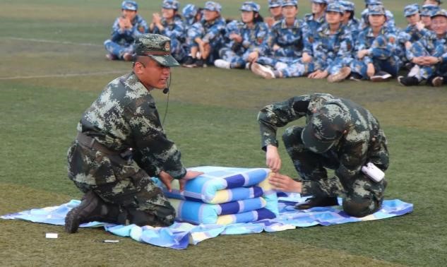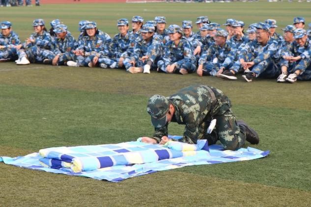 训练场上,一改往日紧张的气氛,同学们围坐在一起,欣赏并学习教官的叠军被技巧。教官熟练地用“展、压、折、叠、整”五个步骤,将一床蓬松的被子叠成了漂漂亮亮的“豆腐块”。同学们纷纷赞叹,跃跃欲试。最后教官总结道:“三分叠,七分整”,这就是叠军被的要诀。
