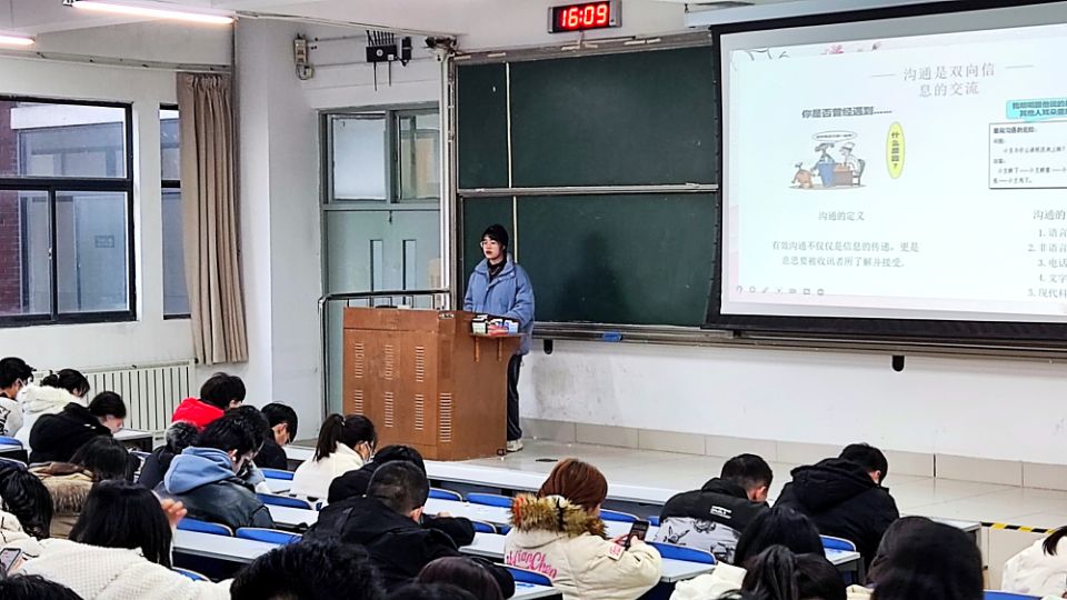 刘禹彤围绕“人际沟通”这一主题,以沟通与人际关系对成功具有重要作用为切入点,从沟通的基本常识、沟通的基本功、解读肢体语言以及网络中的语言文学四个方面为同学们普及了人际沟通中的知识。其中,沟通四要点“听”、“问”、“说”、“答”深受同学们的欢迎。此外,网络文学板块中流行的“废话文学”、“黛玉文学”引起了同学们阵阵笑声。同学们的积极性被充分调动起来,现场氛围良好,同学们受益匪浅。