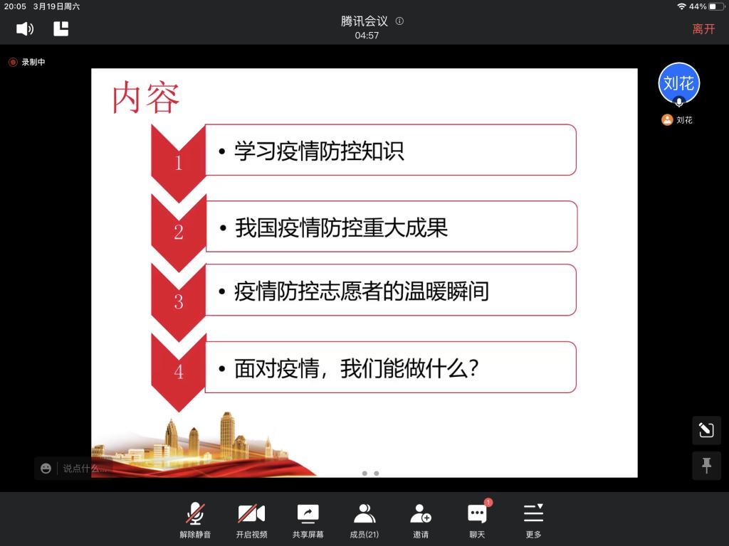 此次活动以调节同学们对待疫情的心态为切入点,结合实例,呼吁同学们正视疫情,积极服从公司的相关防疫安排。同学们积极连麦,主动分享自己在抗疫期间的心得与感受,格外鼓舞了大家对疫情阴霾终将散去、疫情终将被战胜的必胜决心,点燃了同学们积极抗疫的热情,传递了正能量。同学们在班会中更加明确了学习的重要性,即使在网课期间,也要学会合理安排时间,不能放松学习。