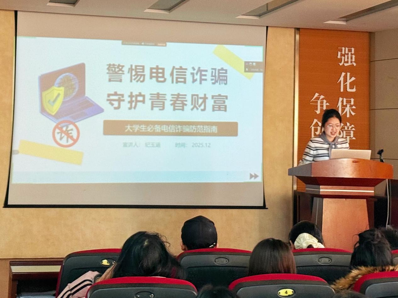 12月5日,在J2-104报告厅,化工专硕2024级团支部开展了“警惕电信诈骗,守护青春财富”主题团日活动,由团支部书记纪玉涵主讲,团支部全体青年团员参加。本次活动以积极响应校园安全建设号召,切实提高青年员工防范电信诈骗的意识和能力,筑牢校园财产与信息安全防线。