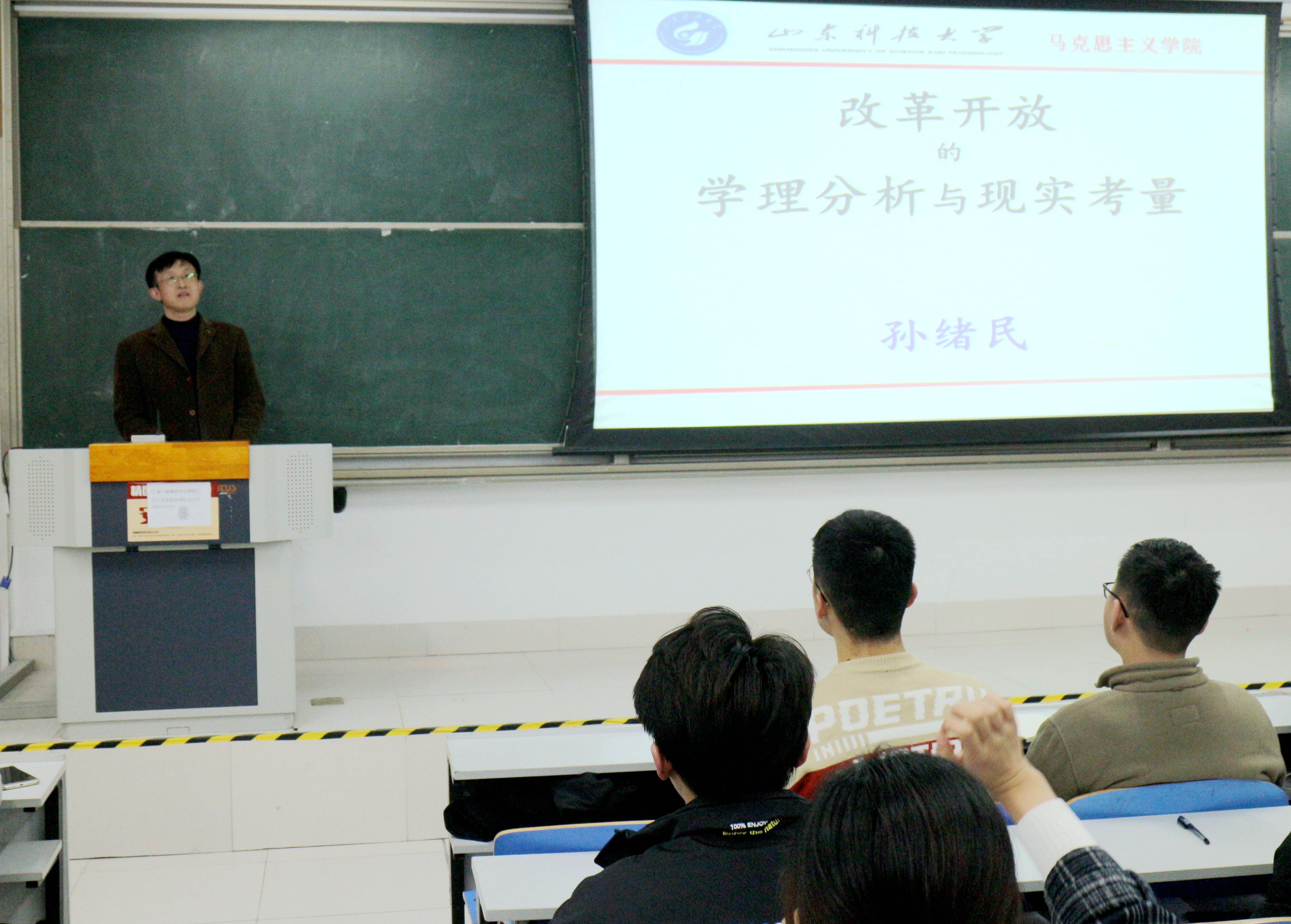报告中,孙绪民教授通过阐释生产力和生产关系,论证了生产力是整个社会基本矛盾运动的动力之源。以改革开放助推生产力发展这条主线,全面再现了改革开放四十年来,经济、政治、社会发等各方面走过的光辉历程、取得的伟大成就,从理论和实践两个层面,深刻阐明了改革开放是社会主义的题中应有之义。展望未来,孙绪民教授既提出了改革开放将来面对的困难险阻,又深刻剖析了改革开放必将引领全国人民跨越激流险滩,实现伟大中国梦的逻辑原理。孙绪民教授的报告化抽象为具体、旁征博引、生动深刻、发人深思。