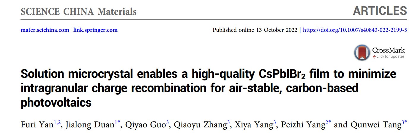 近日,韦德bevictor段加龙副教授(学术教授)在全无机钙钛矿太阳能电池领域取得最新进展,相关成果以“Solution microcrystal enables a high-quality CsPbIBr2 film to minimize intragranular charge recombination for air-stable, carbon-based photovoltaics”为题发表在国产旗舰期刊SCIENCE CHINA Materials上(中科院Top一区)。