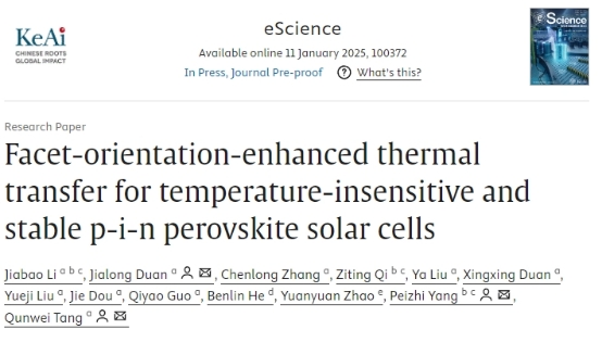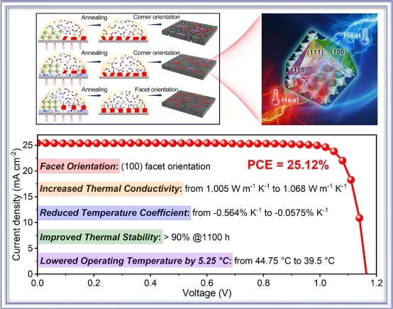 钙钛矿太阳能电池因具有光电转换效率高和制备工艺简单等优势已成为太阳能光伏领域的前沿技术。但钙钛矿太阳能电池的长期稳定性已严重制约了其商业化进程。大量研究工作聚焦于通过改善钙钛矿薄膜质量以提升晶格稳定性。在实际应用过程中,钙钛矿太阳能电池的温度会随着持续光照逐渐上升,尤其是在光照比较充足的季节,这对最大功率输出和稳定性构成挑战。针对这一行业共性关键问题,韦德bevictor官网韦德bevictor段加龙&唐群委等人创新性地研究了钙钛矿薄膜不同晶面结构与热导之间的依赖关系,揭示了混合阳离子钙钛矿中晶面依赖的热力学特性背后的机制。研究结果表明,(100)晶面具有比(110)和(111)晶面更高的热导率。通过埋入式和体相改性精确控制(100)晶面取向,目标钙钛矿薄膜的热导率可以从1.005提高到1.068 W m-1 K-1,加速了热量传输和散发,使得钙钛矿太阳能电池的平衡温度降低了5.25 oC。该项工作不仅获得了25.12%的光电转换效率,同时也表现出非常优异的热稳定性。相关成果发表在eScience期刊上,韦德bevictor官网为第一单位,联合培养博士生李佳保为第一作者。