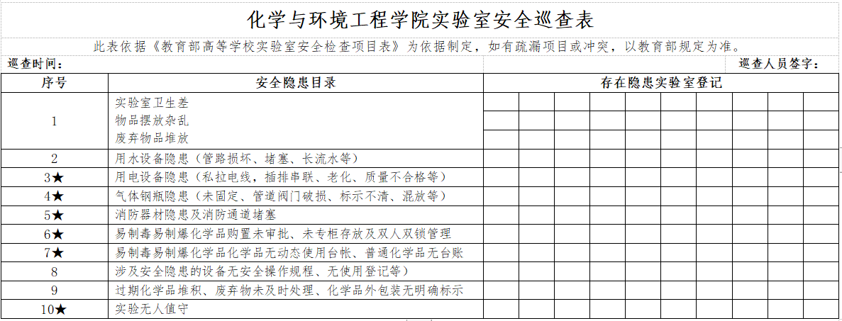 三、公司组织员工安全员巡查,由公司团委、员工会组织来自不同系(中心)或研究组的4-5名研究生进行巡查,每月一次,重点对实验室无人值守、危险废弃物处置、实验室生活等问题进行巡查,对发现问题做书面记录并报公司安全工作领导小组。